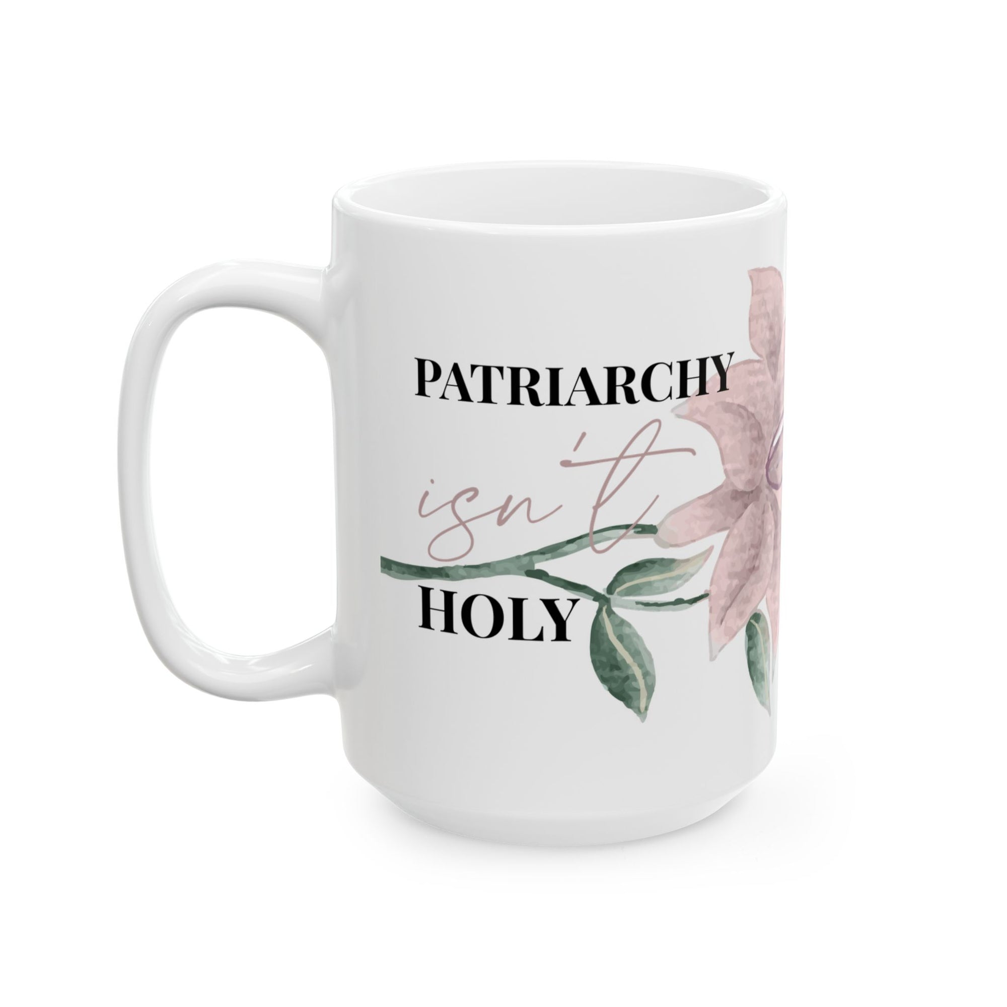 Feminist Floral Ceramic Mug — "PATRIARCHY ISN'T HOLY" Watercolor Wildflowers (11oz & 15oz)